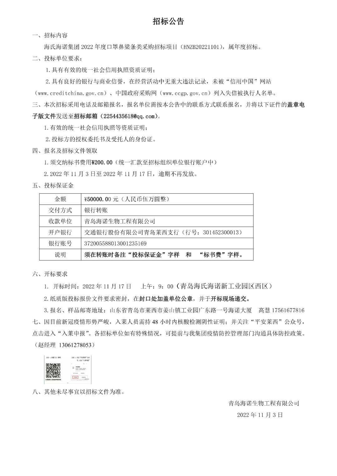 招標公告 | 海氏海諾集團 2022 年度口罩鼻梁條類采購招標項目正式開啟