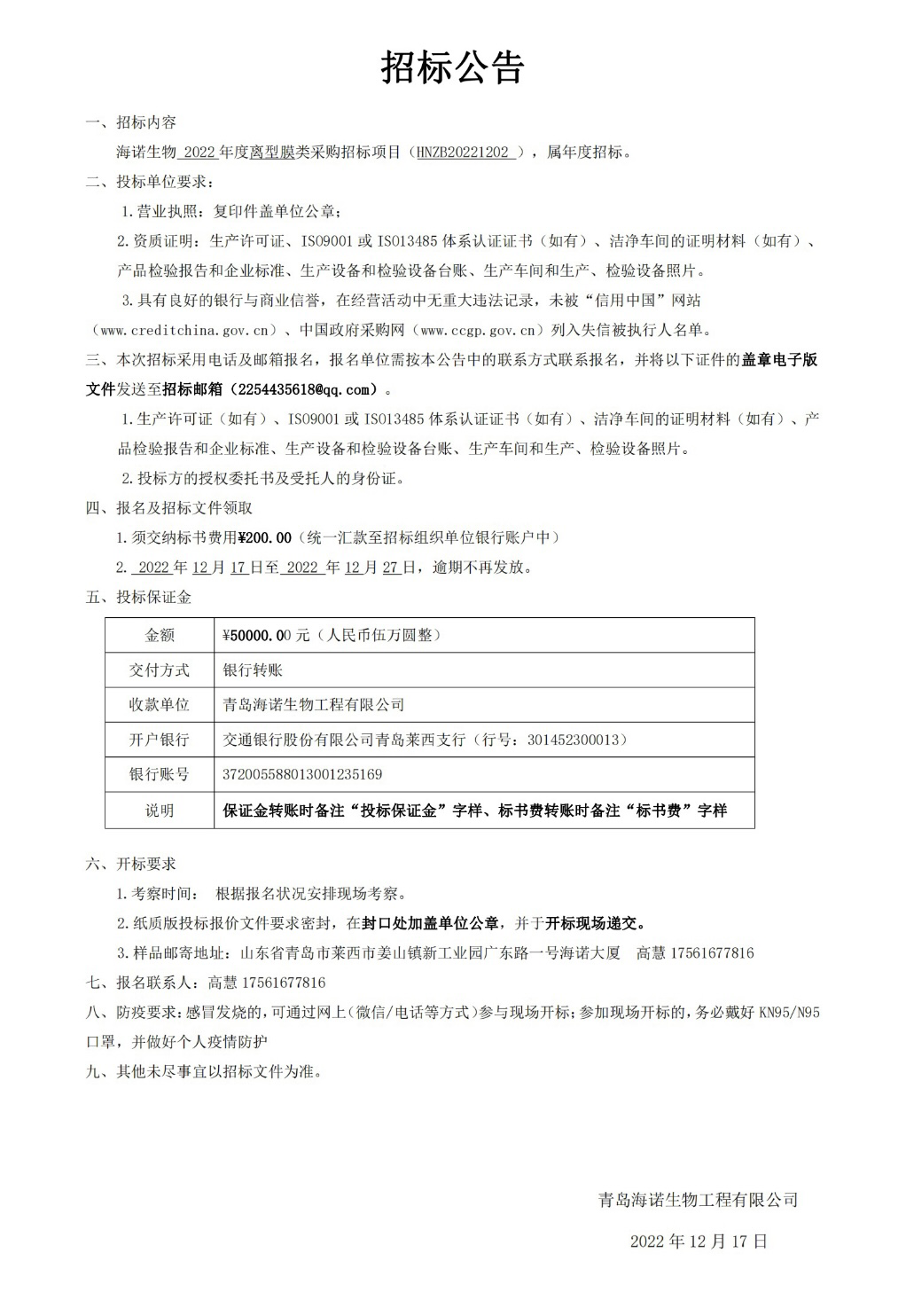 2022.12.18海諾生物2022年度離型膜類采購招標(biāo)項(xiàng)目現(xiàn)已正式開始,屆時(shí)我們將秉承公正、公平、公開、透明的招標(biāo)原則,期待優(yōu)秀供應(yīng)商的廣泛參與。具體招標(biāo)細(xì)節(jié)如下: